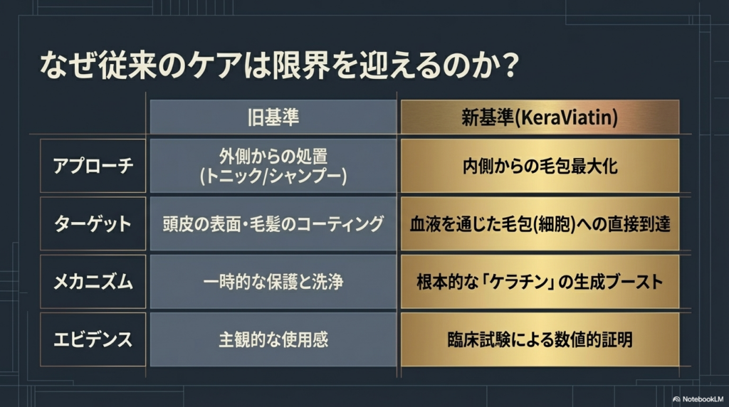 しかし、KeraViatinが提示するのは、身体の内部環境を整えることで、毛包そのもののポテンシャルを最大化させるという戦略だ。