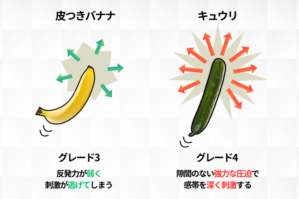 挿入可能な「グレード3(皮つきバナナ)」の硬さでは、反発力が弱く、刺激は途中で逃げてしまいやすい。