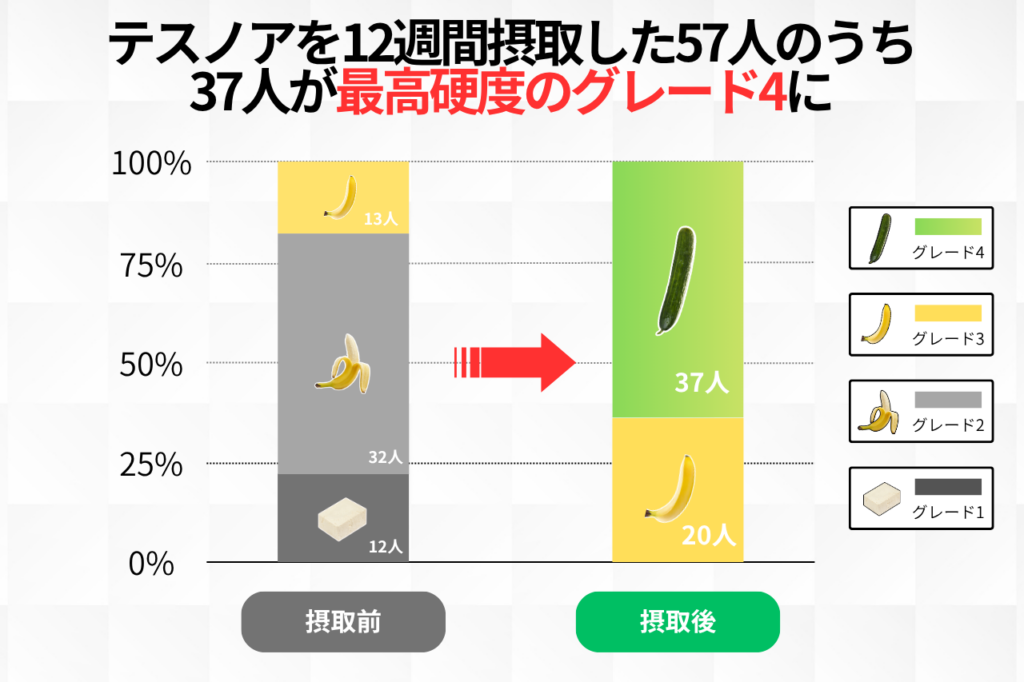 2025年発表の論文(40~70歳の男性57名対象)において、テスノアを12週間摂取した結果、摂取前は平均「2.02(挿入困難)」だったEHSスコアが、平均「3.65(ほぼ完全な硬さ)」へと劇的に向上したのだ。